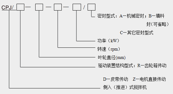 CJJ型號標記及示例: CJJ:側入式攪拌機型號 T:軸封型式代號(填料密封注T,機械密封注M) S1:接液部位材料代號 |