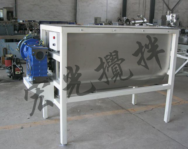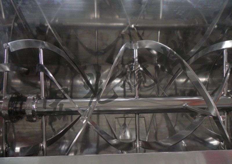 臥式螺帶混合機由U形容器、螺條攪拌葉片和傳動部件組成;螺條狀葉片一般做成雙層或三層,外層螺條將物料從兩側(cè)向中央?yún)R集,內(nèi)層螺條將物料從中央向兩側(cè)輸送,形成對流混合。螺條混合機對于粘性或有凝聚性的粉粒體的混合以及粉粒體中添加液體及糊狀物料的混合有良好的效果,筒蓋可做成全開式門,以便于對設備進行清洗替換產(chǎn)品。